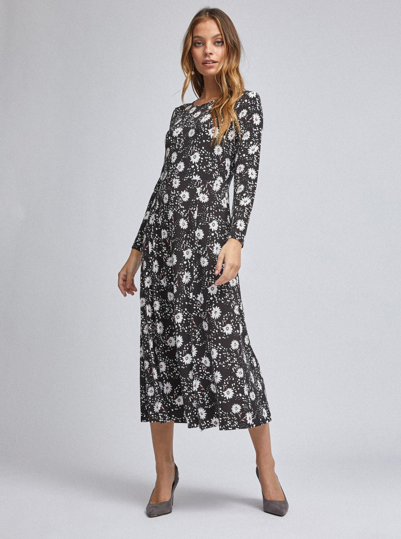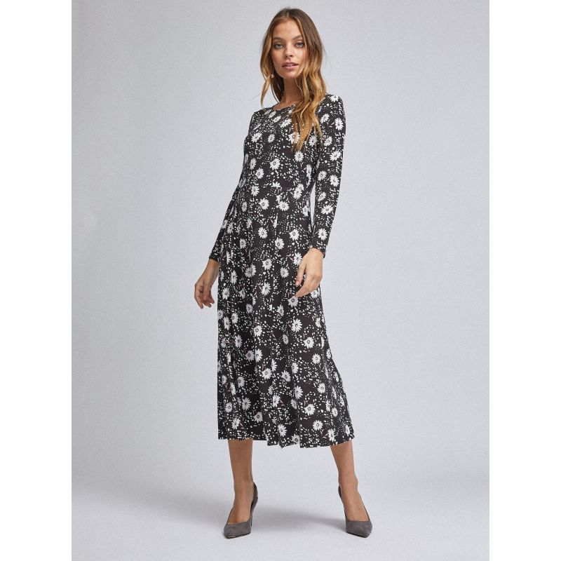 Farba: čierna Vzor: kvetovaný Strih: áčkový Dĺžka: polodlhá Materiál: 94 % viskóza, 6 % elastan